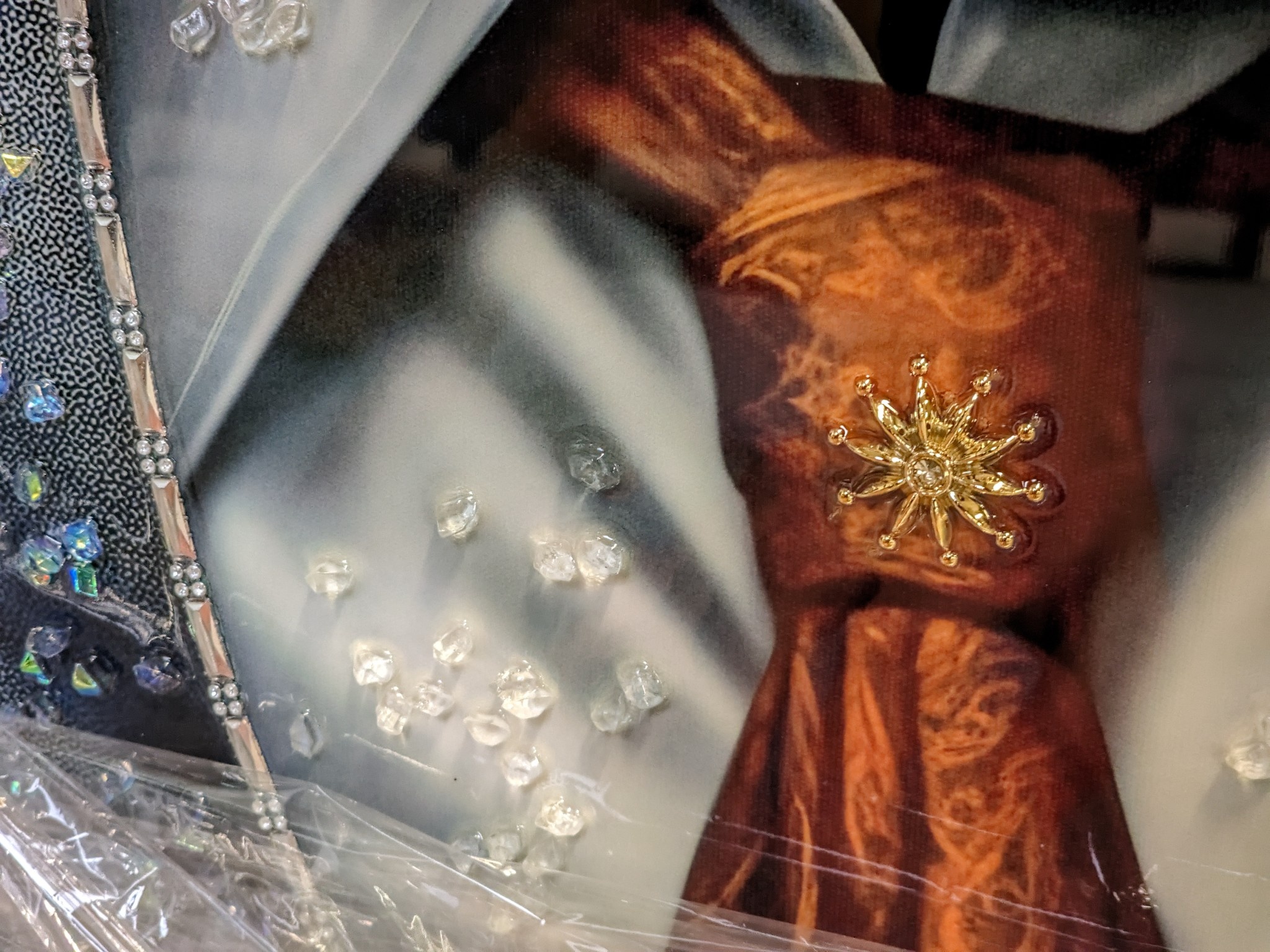 Tenslotte wordt er een dunne uv bestendige folie over heel het doek gespannen, waarna de folie vacuüm gezogen wordt. Resultaat is dan een prachtig zijdeglans schilderij waarbij de strass steentjes voor de hippe maar ook elegante uitstraling zorgt