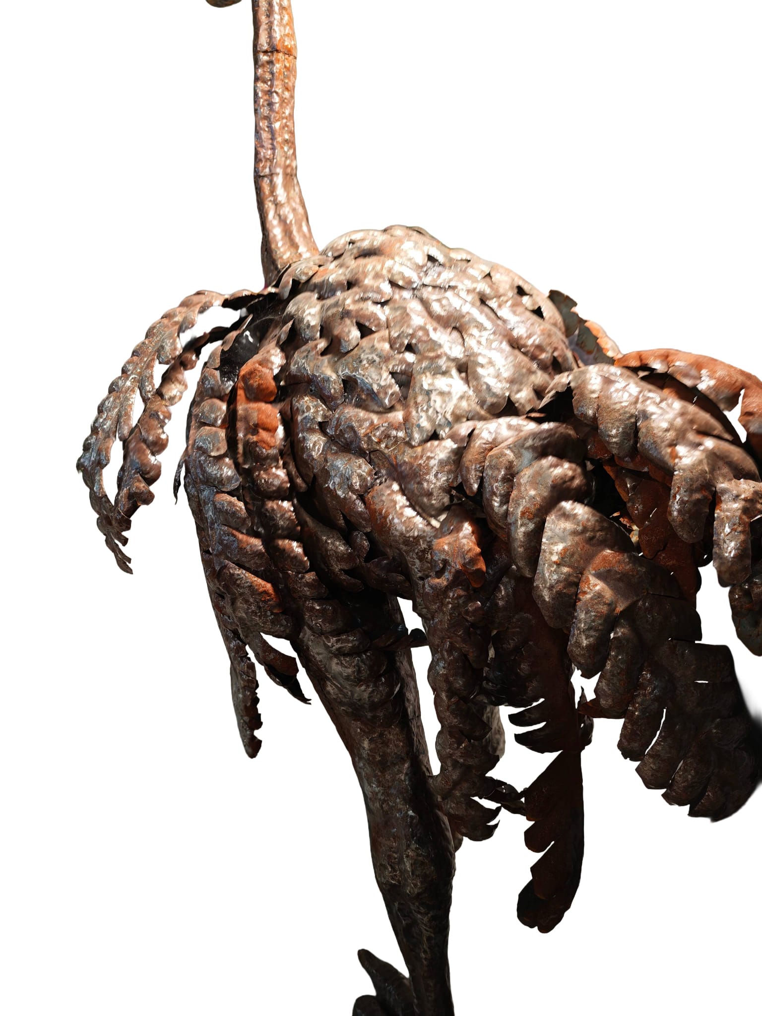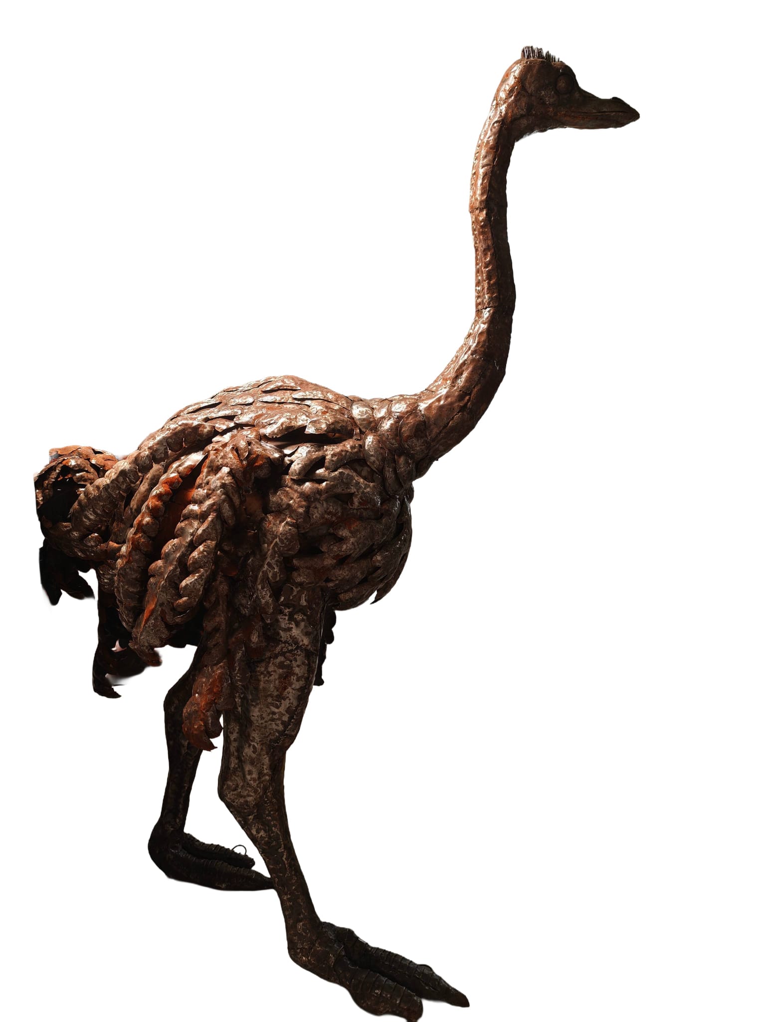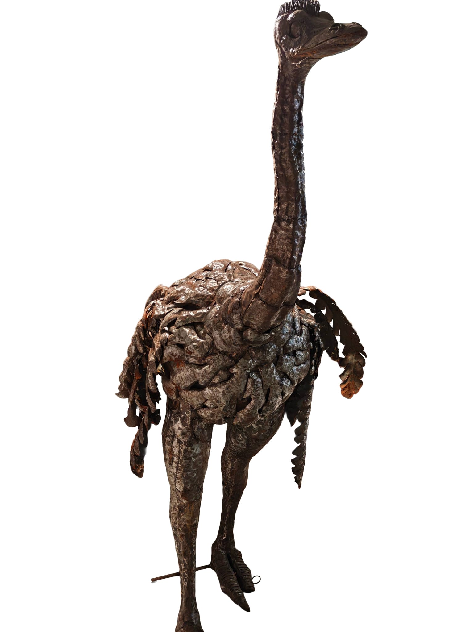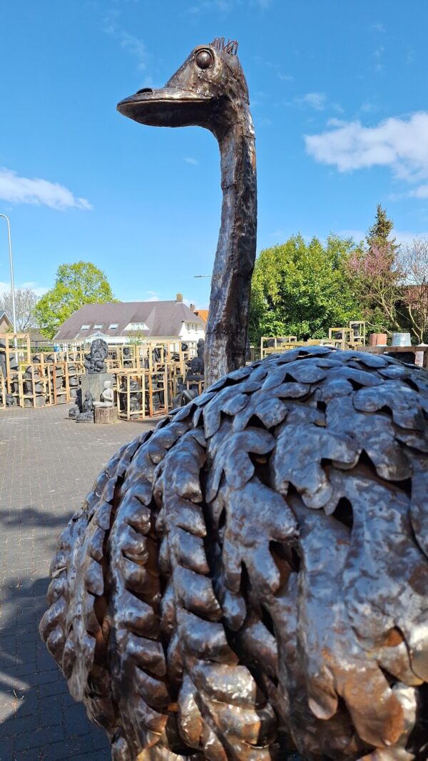 Het zijn echte kunstenaars, die dit beeld van een levensgrote struisvogel met kop omhoog gemaakt hebben. Als je dit beeld lang bekijkt ga je beseffen hoeveel werk het is om een kunstwerk als dit te maken. Kloppen, buigen, lassen, meten, het is echt een gigantisch werk. Wilt u iets unieks in uw tuin of bij uw bedrijf, dan bent u er zeker van dat dit model zeer zeldzaam is en niet zomaar te koop is.