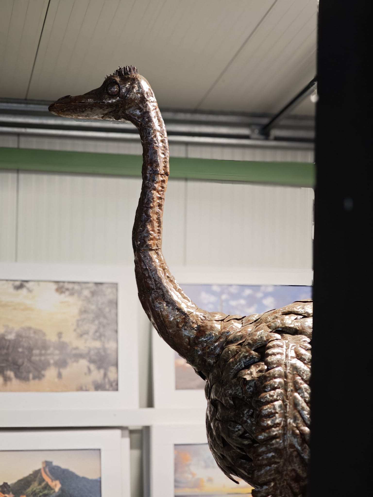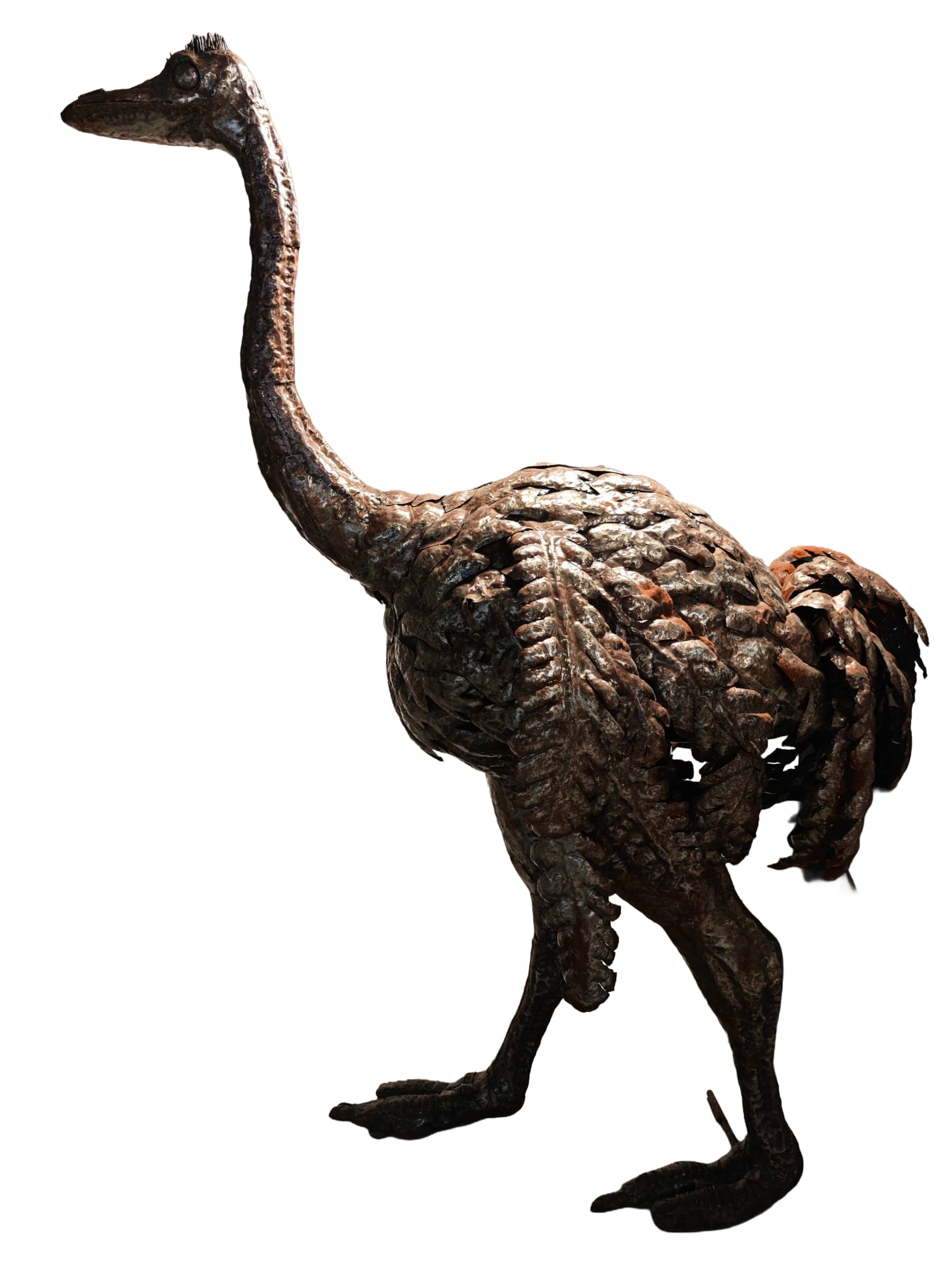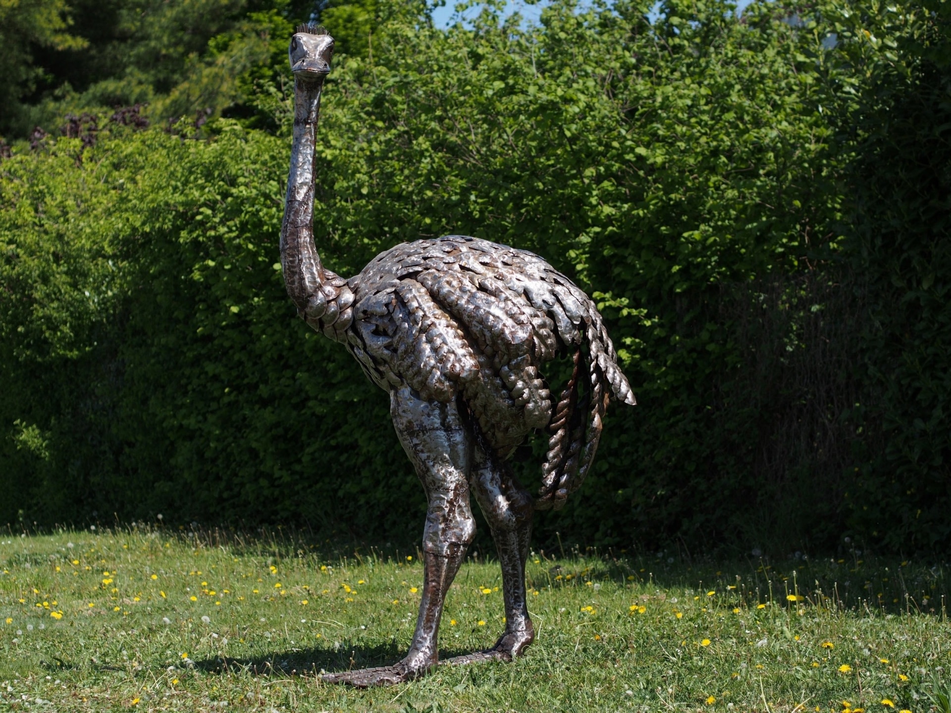 Het zijn echte kunstenaars, die dit beeld van een levensgrote struisvogel met kop omhoog gemaakt hebben. Als je dit beeld lang bekijkt ga je beseffen hoeveel werk het is om een kunstwerk als dit te maken. Kloppen, buigen, lassen, meten, het is echt een gigantisch werk. Wilt u iets unieks in uw tuin of bij uw bedrijf, dan bent u er zeker van dat dit model zeer zeldzaam is en niet zomaar te koop is.