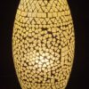 Sfeerlamp van glas. Prachtig handgemaakte mozaïek lamp, in hoge, smalle vorm. Elk wit glassteentje is handmatig op het onderliggende glas opgebracht. In het donker geeft deze tafellamp een prachtig lichteffect zodra het licht door het mozaïek schijnt. De smalle, hoge vorm zorgt ervoor dat deze lamp ook kan staan op smallere ondergronden zoals vensterbanken, planken ed.