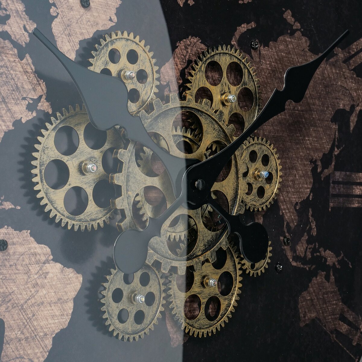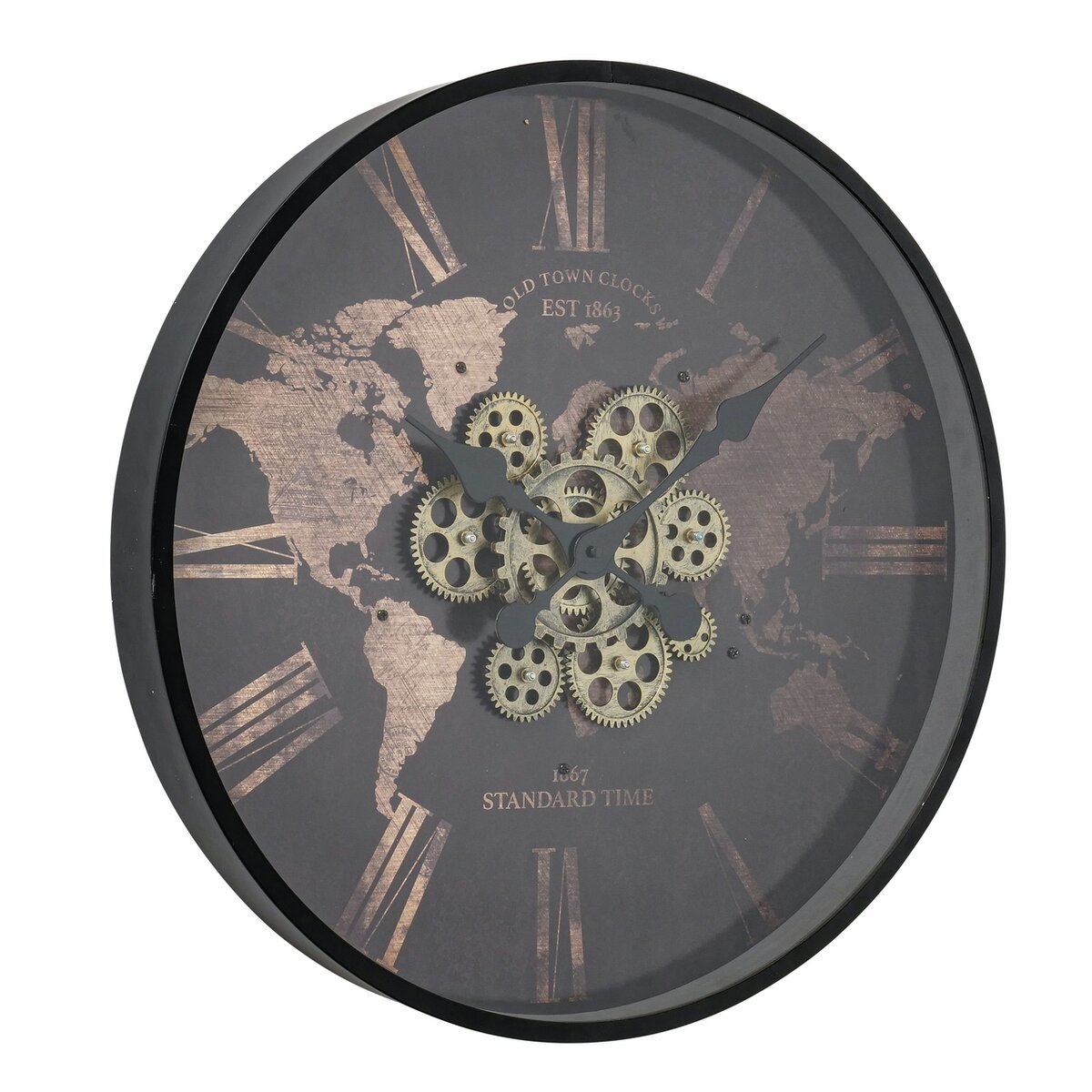 Het wordt een feest om nu te kijken hoe laat het is, met deze mooie ronde zwart/koper kleurige muurklok met bewegende delen en de wereldkaart op de achtergrond.
