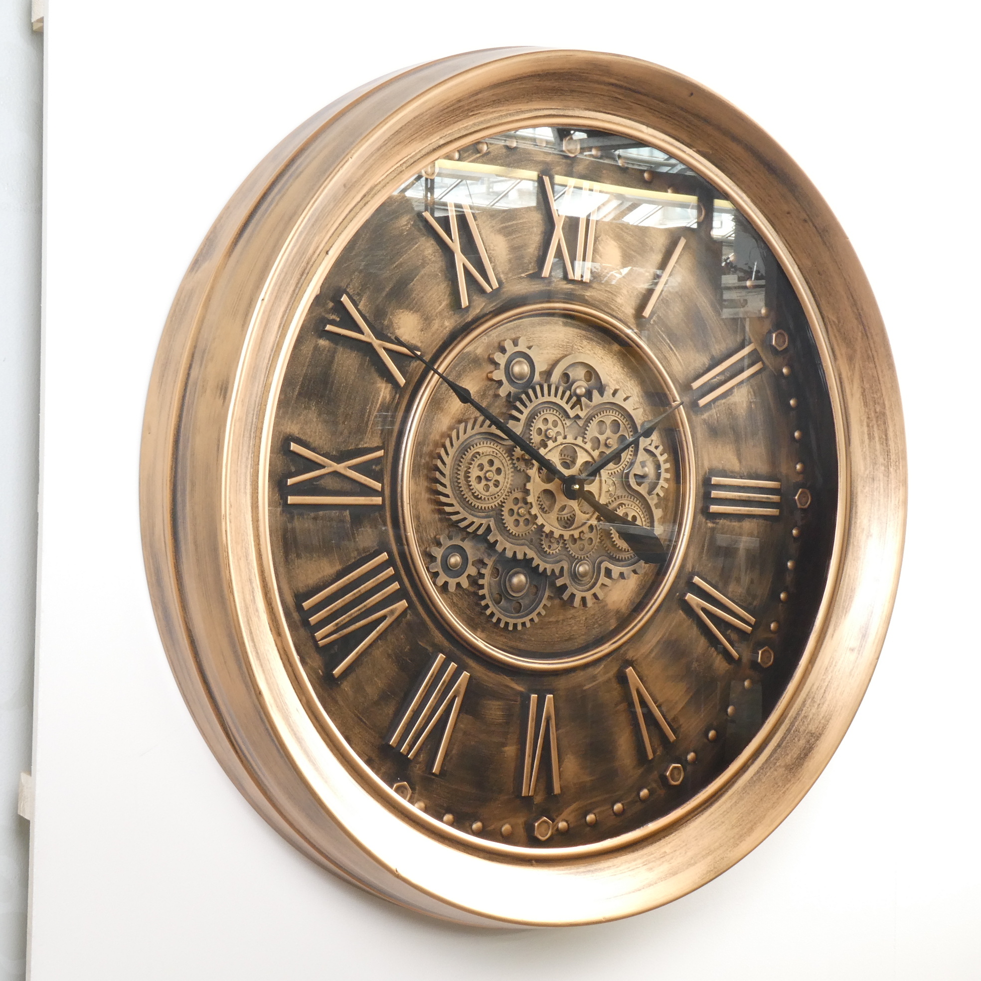 Het wordt een feest om nu te kijken hoe laat het is, met deze supergrote dikke ronde old goud kleurige muurklok met draaiende tandwielen. Deze zeer mooie klok heeft een stalen frame in een oldgouden kleur, antraciete achtergrond, met subtiele Romeinse cijfers.