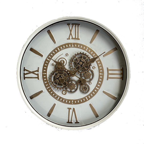 Het wordt een feest om nu te kijken hoe laat het is, met deze mooie ronde wit/bruin kleurige muurklok met bewegende delen. Deze zeer mooie klok heeft een stalen frame in een witte kleur, met romeinse cijfers.