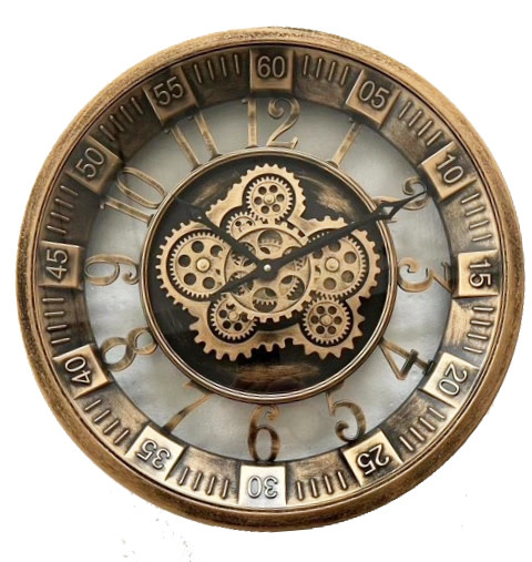 Het wordt een feest om nu te kijken hoe laat het is, met deze mooie open ronde brons kleurige muurklok met bewegende delen. Deze zeer mooie klok heeft een stalen frame in een bruine kleur, met subtiele cijfers.
