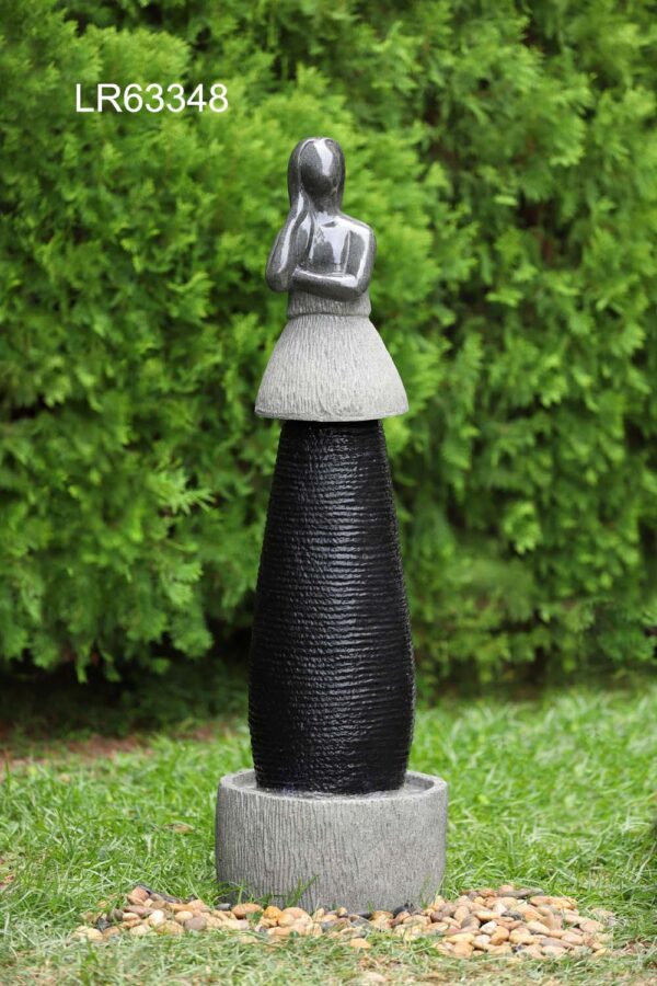 Een stevig gemaakte terrasfontein met een vrouwenbeeld die overal geplaatst kan worden. Gemaakt van het sterke en kleurvaste Polyresin. Dit model kunt u overal plaatsen, omdat dit model zelfvoorzienend is, want de watervoorraad zit namelijk in de onderzijde van de fontein.