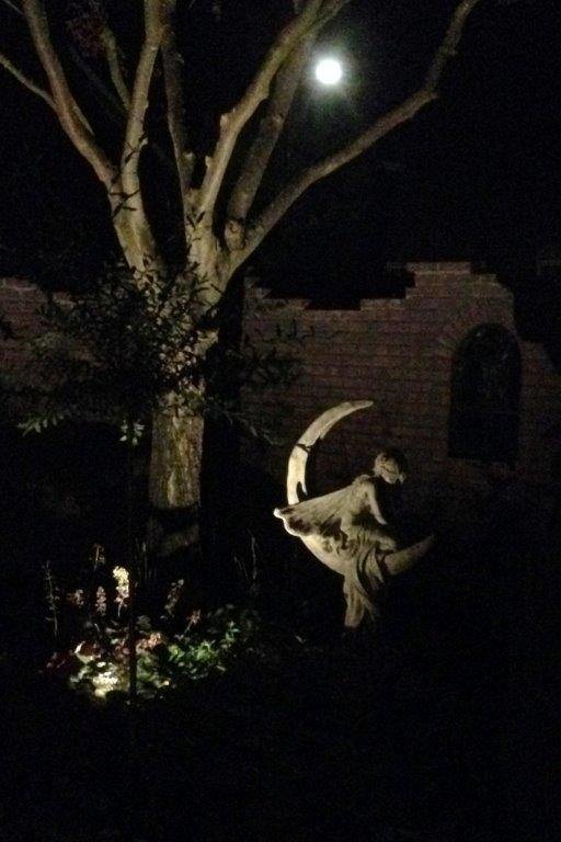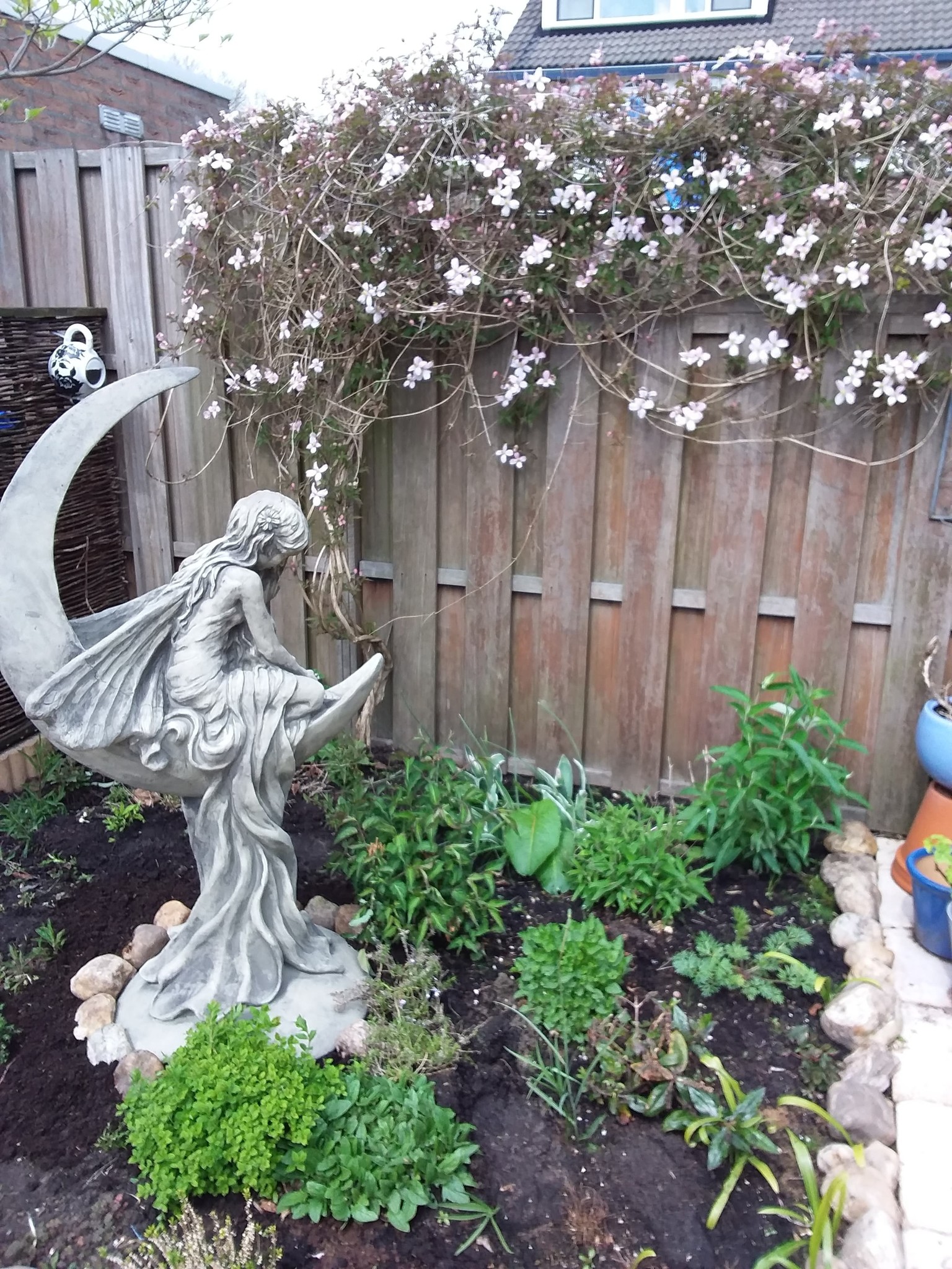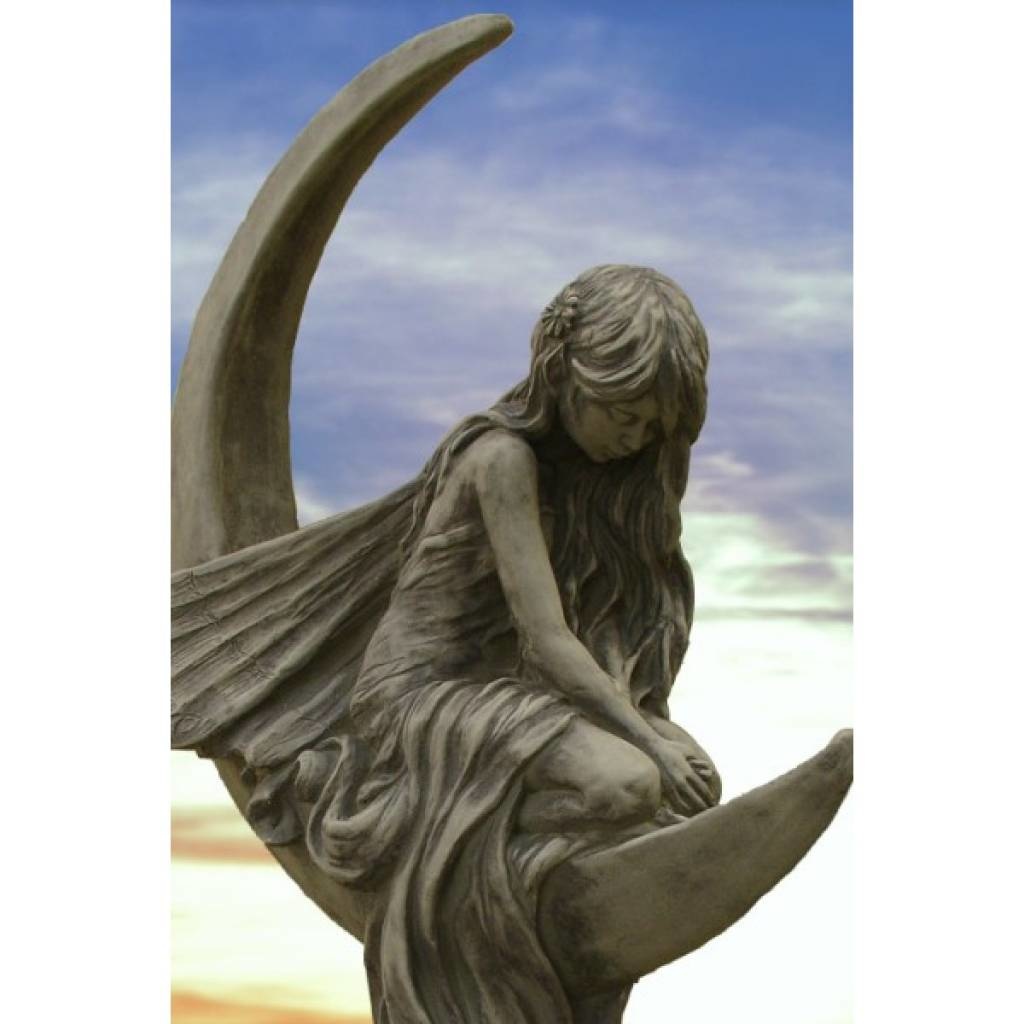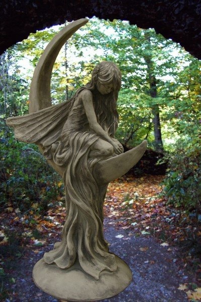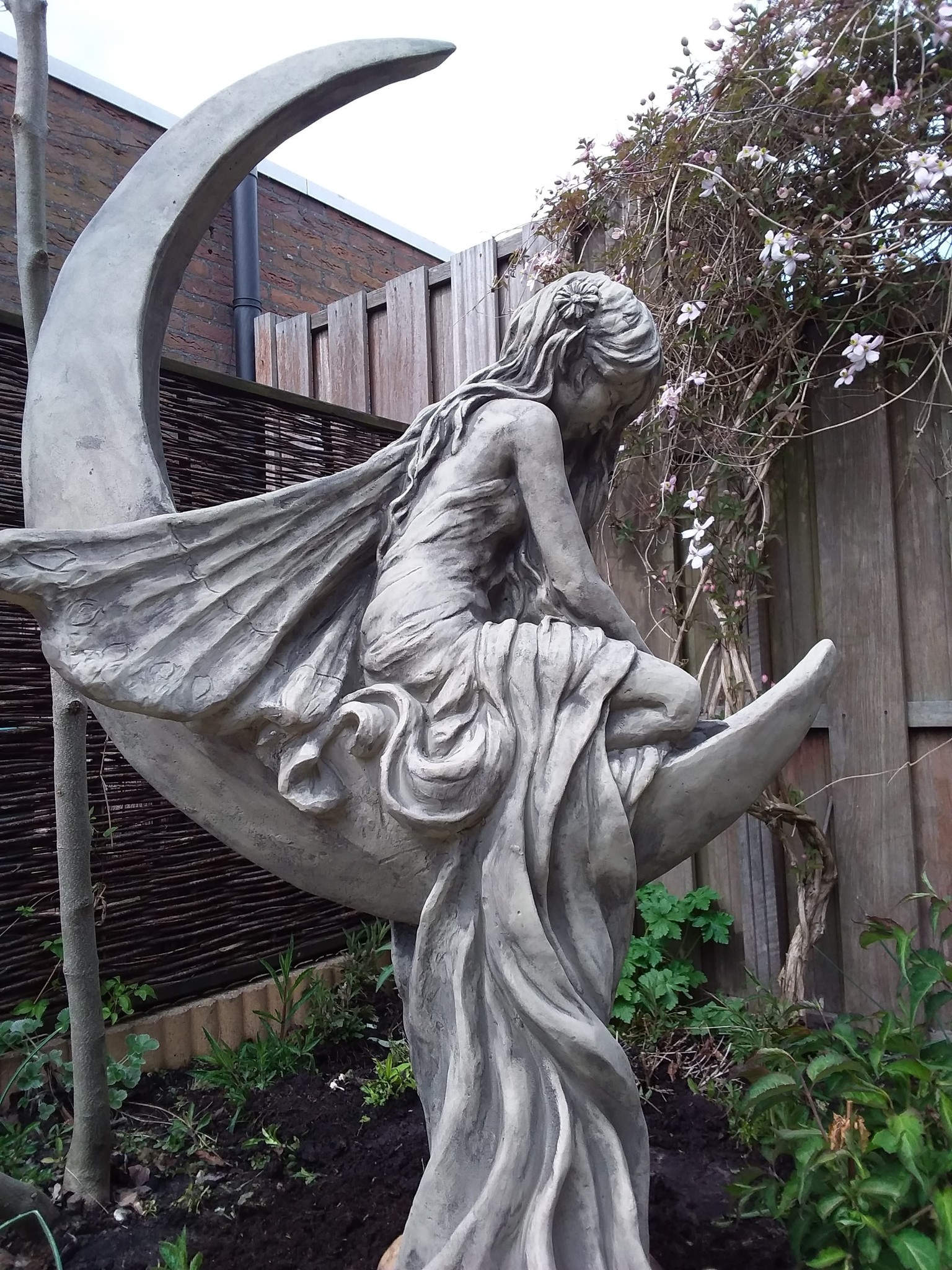 Elfje Lunaria die rust in de maan, grootte maar liefst 125cm hoog en 110kg zwaar. Mooi gedetailleerd. Hoogwaardig massief gietsteen, grijs ingewassen. Past eventueel ook op grote sokkel.