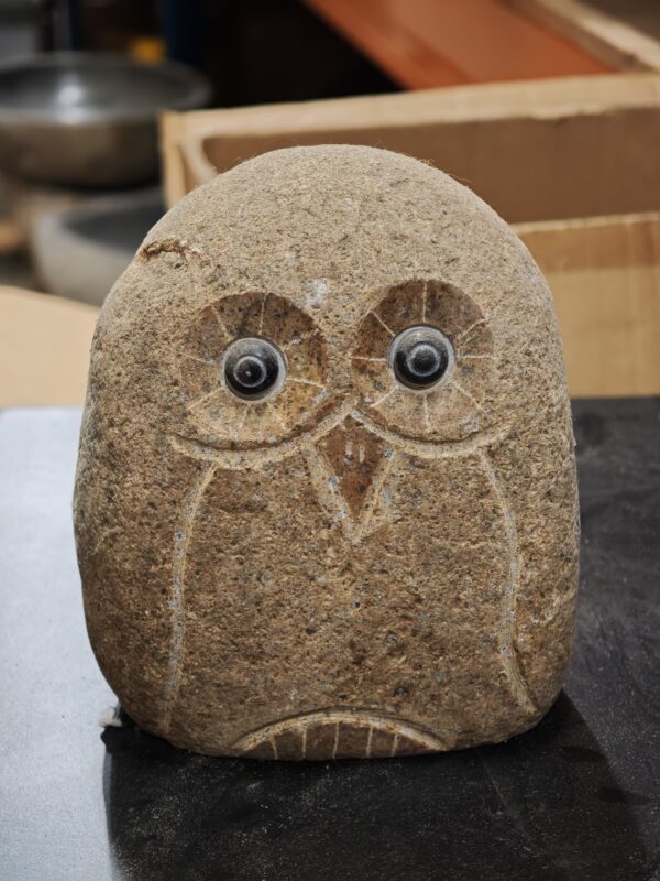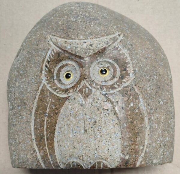 Prachtige stenen beeld van een uil, met de hand gemaakt op een zwerfkei van 15cm. Eerst wordt de afbeelding op de kei getekend, waarna met een beiteltje de lijnen en sommige oppervlakken uitgehakt worden, zodat er diepte verschillen ontstaan. De hoogst liggende delen worden daarna zorgvuldig gepolijst. Een enorme klus, maar het resultaat mag er dan zijn.
