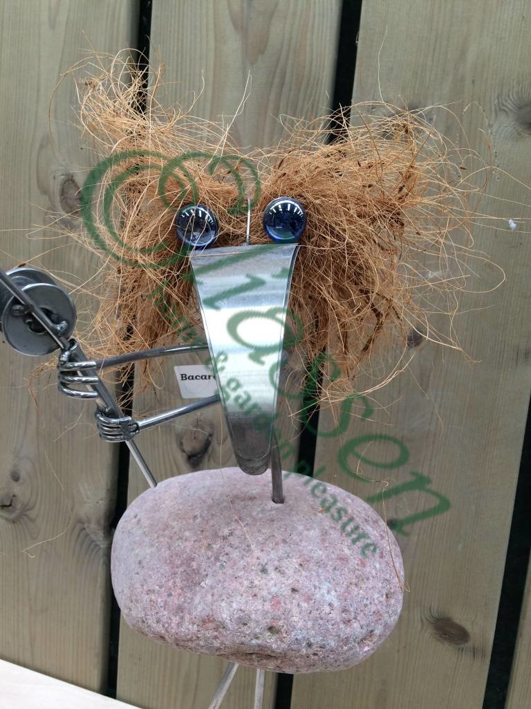 Leuk in de tuin maar ook binnenshuis, deze exclusieve figuur van een vissende vogel met pruikje, met een natuurkei als lijf. Stevig staand, met een levenslange levensduur bij normale omstandigheden.Geheel is ambachtelijk gemaakt van rvs. Doordat het handwerk is zullen er altijd kleine verschillen in elk exemplaar kunnen bestaan met de foto, Ook de kei kan anders zijn qua kleur en vorm, hierop kan niet gereclameerd worden.