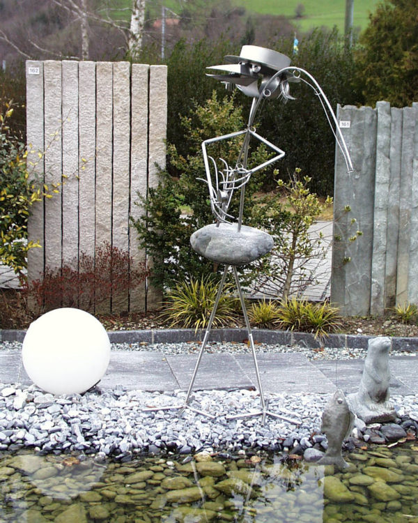 Leuk in de tuin, dit exclusieve figuur van een grappige vogel met een hengel in de hand van maar liefst 220cm hoog. Ambachtelijk gemaakt van rvs. Doordat het handwerk is zullen er altijd kleine verschillen in elk exemplaar kunnen bestaan met de foto, Ook de kei kan anders zijn qua kleur en vorm, hierop kan niet gereclameerd worden.