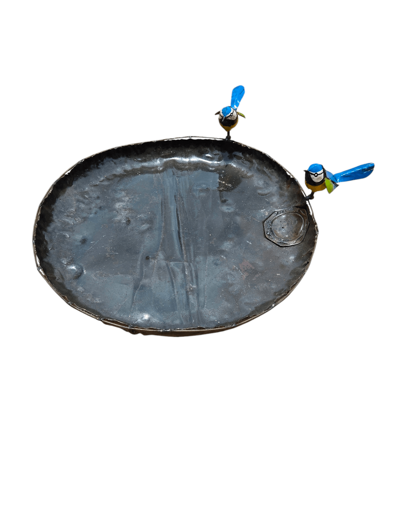 Handgemaakte, fairtrade vogelschaal (Ø 28 cm) uit Zimbabwe, gemaakt van gerecycled staal. Geschikt als voeder- of drinkbak, uniek door handwerk.