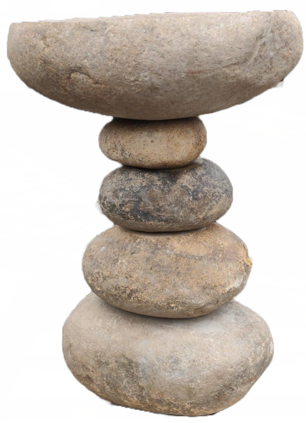 Deze vogeldrinkplaats komt pas goed tot zijn recht in uw tuin. Dit model vogelbad bestaat uit gestapelde, op elkaar afgestemde rivierkeien, waarin een stalen pijp loopt, met daarop een met de hand uitgehouwen hol gemaakte rivierkei, die daarna helemaal gepolijst is aan de binnenzijde. Alle exemplaren van deze vogeldrinkschalen zullen afwijken van de foto, omdat geen enkele steen hetzelfde is.