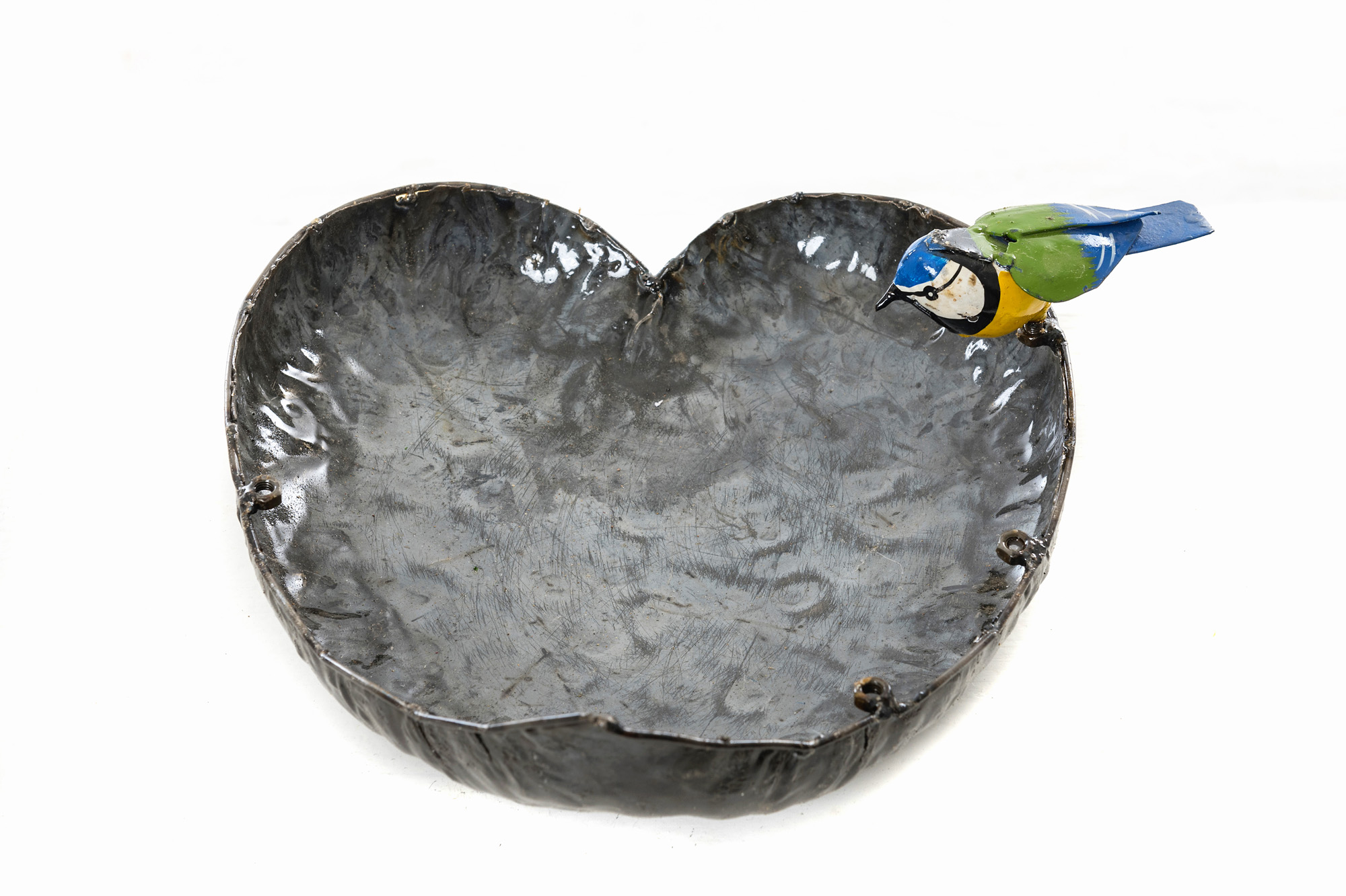 Het metalen schaaltje heeft een donkere, rustieke afwerking met een lichte structuur, wat zorgt voor een authentieke en stoere uitstraling. Het geheel wordt opgevrolijkt door een parmantig Koolmeesje dat op de rand van het hartje balanceert. Dit metalen vogeltje is met de hand beschilderd in frisse, herkenbare kleuren: een helder geel buikje, blauwe vleugeltjes en het typische zwart-witte kopje. U kunt de schaal gebruiken om vogelzaad in aan te bieden, maar hij is ook uitermate geschikt als waterbadje tijdens warme dagen.