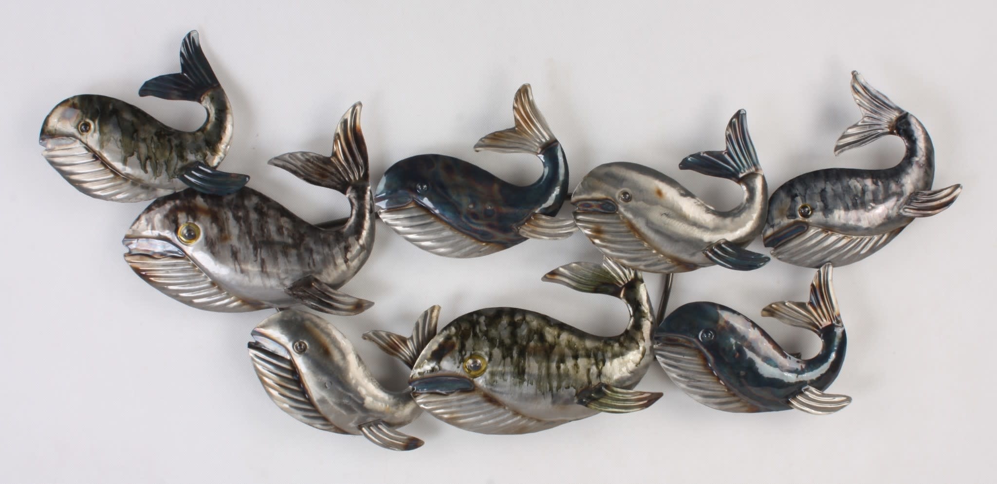 Dit 3-dimensionale metalen muurdecoratie kleedt elk modern interieur of werkplek prachtig aan. Dit model met walvissen zal een sfeervolle en tijdloze stuk wanddecoratie en een ware blikvanger zijn.