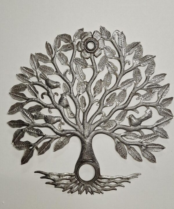 Dit stuk muurdecoratie Met levensboom met vogeltjes is een lust voor het oog. Dit model muurdeco van een levensboom is gemaakt in Haiti, door de zgn Bosmetal werkers, en van de bovenkant van een oliedrum, en hiermee is men dagenlang aan het werk om dit product te realiseren. Knippen, met hamer bollen of juist vlakken, met drevel bewerken en schilderen. Als men de artikel goed bekijkt sta je er versteld hoeveel werk moet zijn geweest. Als u dit artikel bestelt steunt u de wereldwinkel organisate Our Market en steunt u deze mensen in het straatarme Haiti.