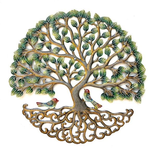 Haal een stukje unieke wereldkunst in huis met deze prachtige wanddecoratie. De Levensboom, of Tree of Life, is schitterend vormgegeven met een sierlijk wortelstelsel en een volle kroon met groene bladeren. Wat direct opvalt, zijn de twee kleurrijke vogeltjes die gezellig tegenover elkaar op de onderste takken zitten. Dit kunstwerk is niet zomaar een decoratiestuk; het vertelt een bijzonder verhaal van vakmanschap en hergebruik.