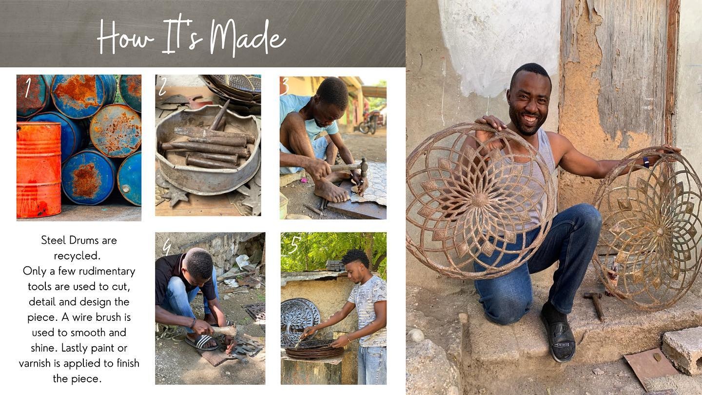 Dit stuk muurdecoratie is een lust voor het oog. Dit model muurdeco van een hart met muzieknoot is gemaakt in Haiti, door de zgn Bosmetal werkers. Dit symbolische wanddeco is gemaakt van de bovenkant van een oliedrum, en hiermee is men dagenlang aan het werk om dit product te realiseren. Knippen, met hamer bollen of juist vlakken, met drevel bewerken en schilderen. Als men de artikel goed bekijkt sta je er versteld hoeveel werk moet zijn geweest. Als u dit artikel bestelt steunt u de wereldwinkel organisate Our Market en steunt u deze mensen in het straatarme Haiti.