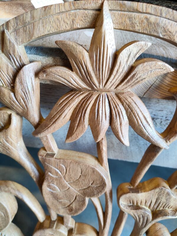 Mooi Houten wandpaneel handmatig gemaakt van massief Suar hout. Afgebeeld zijn prachtige bloemen. Heel veel uren snijwerk zit in dit houten paneel. Alles wat je ziet; elk krulletje en takjes, alles is gemaakt door mensen handen.