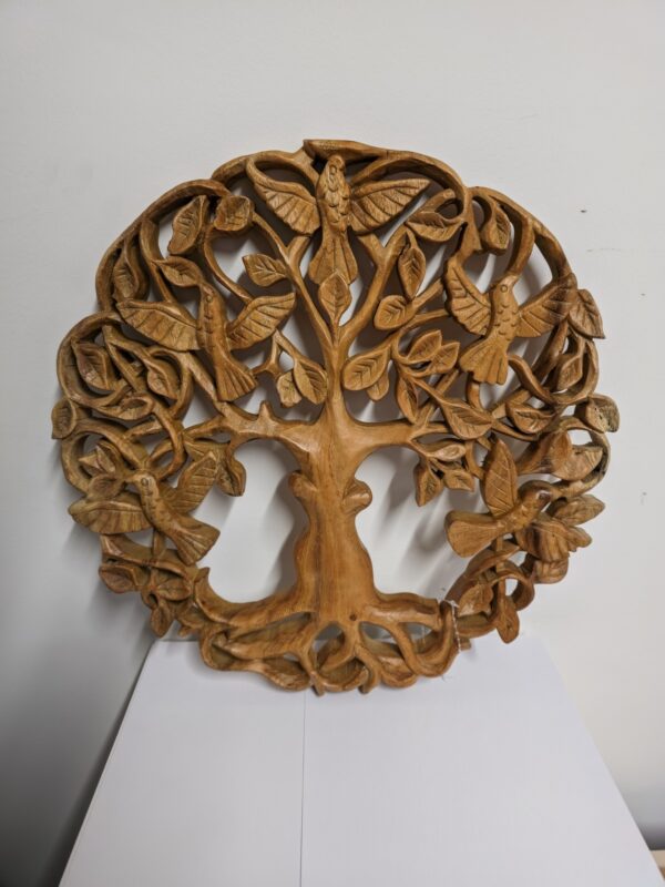 Houten wandpaneel met een levensboom met vogels en bladeren. Handmatig gemaakt van massief Suar hout. Afgebeeld is een prachtige levensboom met vogels en bladeren. Heel veel uren snijwerk zit in dit houten paneel. Alles wat je ziet; elk krulletje, vogeltje en takjes, alles is gemaakt door mensen handen.
