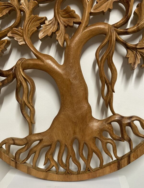 Houten wandpaneel handmatig gemaakt van massief Suar hout. Afgebeeld is een prachtige levensboom. Heel veel uren snijwerk zit in dit houten paneel. Alles wat je ziet; elk krulletje Mooi en takjes, alles is gemaakt door mensen handen.
