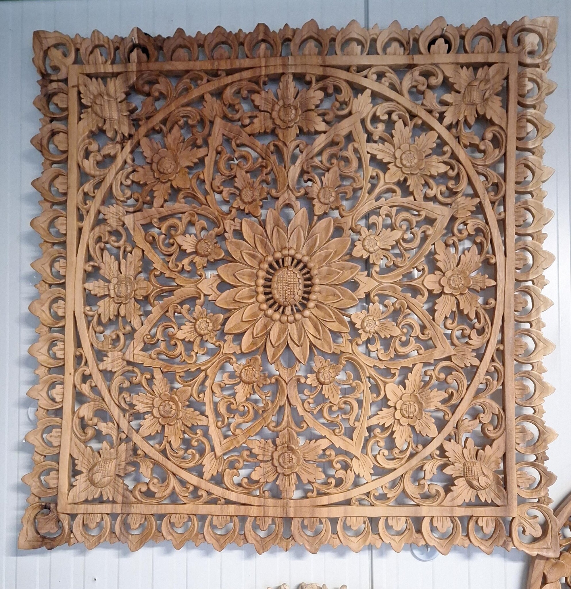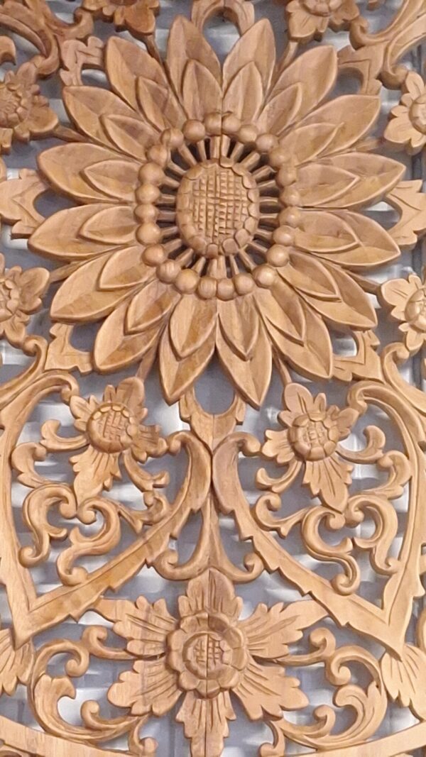 Mooi Houten wandpaneel handmatig gemaakt van massief teak hout. Afgebeeld is een prachtige mix van krullen, bloemen, rozetten . Heel veel uren snijwerk zit in dit houten paneel. Alles wat je ziet; elk krulletje en takjes, alles is gemaakt door mensen handen. Doordat het hout is, en een groot vlak, kan een paneel van deze grootte enigzins krom zijn. Kom deze serie ook gerust live bekijken.