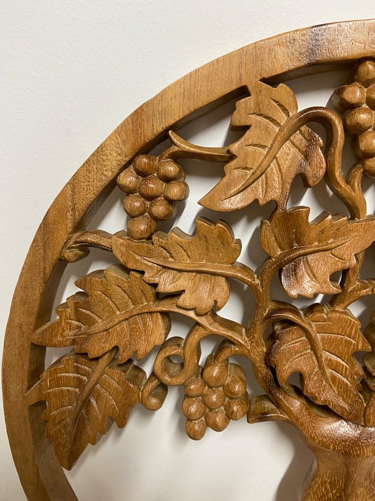 Houten wandpaneel met een boom met druiventrossen. Handmatig gemaakt van massief Suar hout. Afgebeeld is een prachtige levensboom met druiven trossen. Heel veel uren snijwerk zit in dit houten paneel. Alles wat je ziet; elk krulletje Mooi en takjes, alles is gemaakt door mensen handen.