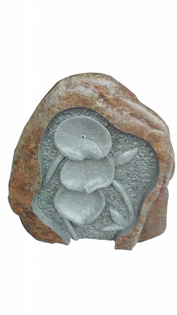 - Staat ook zeer mooi bij plaatsing een in vijver. Het water komt op een subtiele manier uit het bovenste blad en loopt over de andere bladeren zo naar beneden.