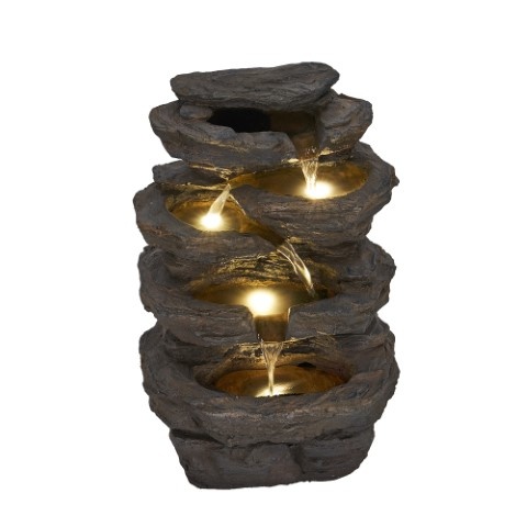 Een echte blikvangertje voor in uw tuin, huis of bedrijf, deze nagemaakte rotsige watervalletje met natuurlijke uitstraling. Vooral tussen de planten is deze waterloop een prachtig tuinornament die een is met de omgeving. Deze 42cm hoge waterval wordt prachtig verlicht door middel van leds op 4 plaatsen, wat is het donker voor een prachtig schouwspel zorgt.