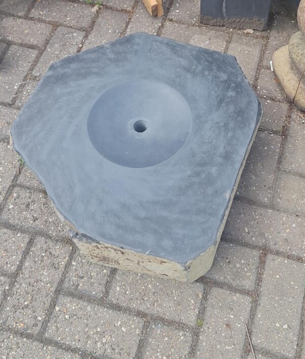 Waterplateau van basaltsteen, met gepolijste en uitgeholde bovenkant. In deze lage watertafel kan een ledlampje geplaatst worden, maar nog veel mooier wordt het als het verlicht wordt met een spot. Deze basaltstenen komen zo in de natuur voor en kunnen dus verschillen in vorm en kleur. Echt een set voor de natural-look liefhebber. Wanneer het plateau werkt nat is, wordt het wat donkerder (zie foto).