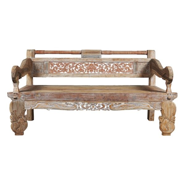 Voeg een vleugje klassieke elegantie toe aan je tuin of huis met deze teakhouten vleugelbank. Deze unieke vleugelbank is vervaardigd uit gerecycled hout van huizen en schepen, dat is opgeschuurd en voorzien van een verfijnde whitewash. Het gedetailleerde houtsnijwerk en stevige constructie maken deze bank tot een prachtig en duurzaam meubelstuk voor je huis of tuin.