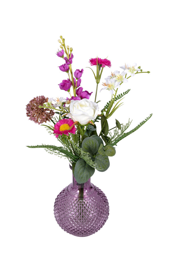Is dit leuk, een kant en klaar zijde boeketje in glasvaas met overwegend frisse paarse en witte kleuren. Boeket is Ca 38cm hoog en staat vast in een paars kleurig glasvaasje in de maat 11x15cm.