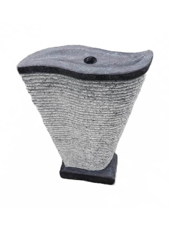 Prachtige zuilenset, in eigen beheer ontwikkeld en alleen bij ons te koop! Gemaakt van zwart graniet in een speelse vorm, aan bovenzijde uitgehold en gepolijst, aan de zijkanten ingezaagd voor een sfeervol watereffect.